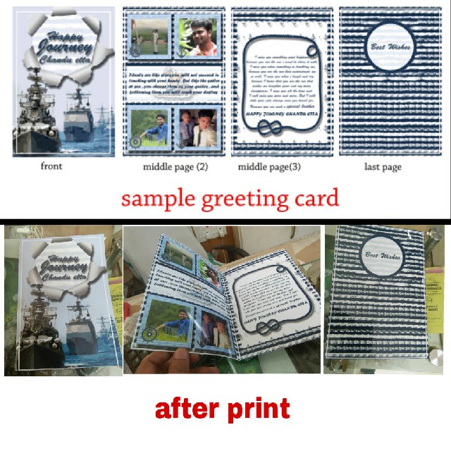i will design greeting card for you. i will design it in an image format you have to print it out by yourself. you can give me the photos which you want to include in your card.